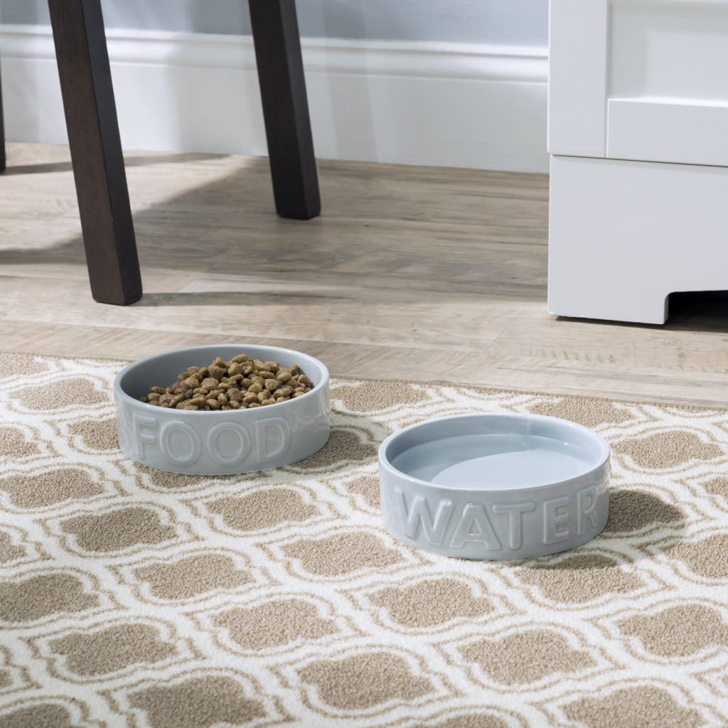 The "FOOD" pattern pet bowl is a decorative, designer dish dressed in pale gray. Each premium-quality pet bowl is crafted from heavyweight, chip-resistant ceramic that stands strong against slippage and spills.