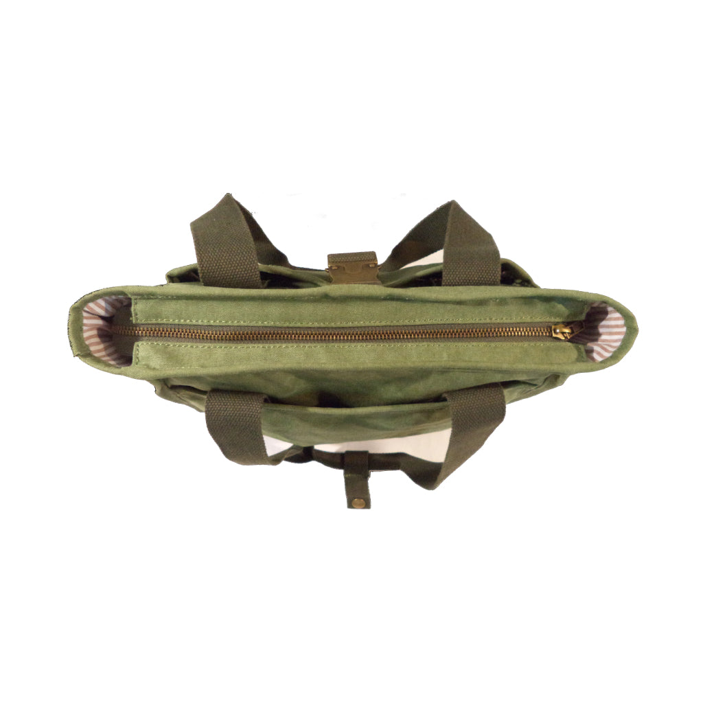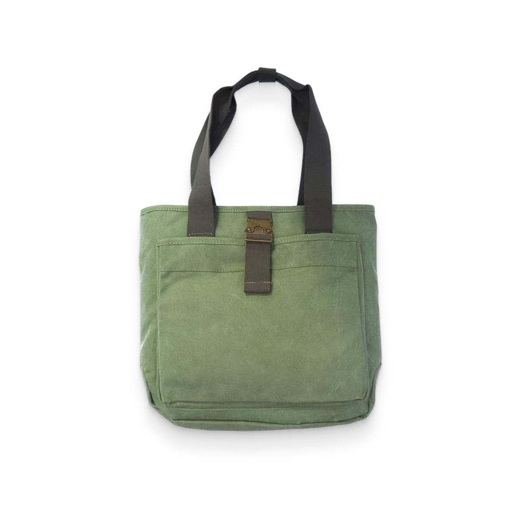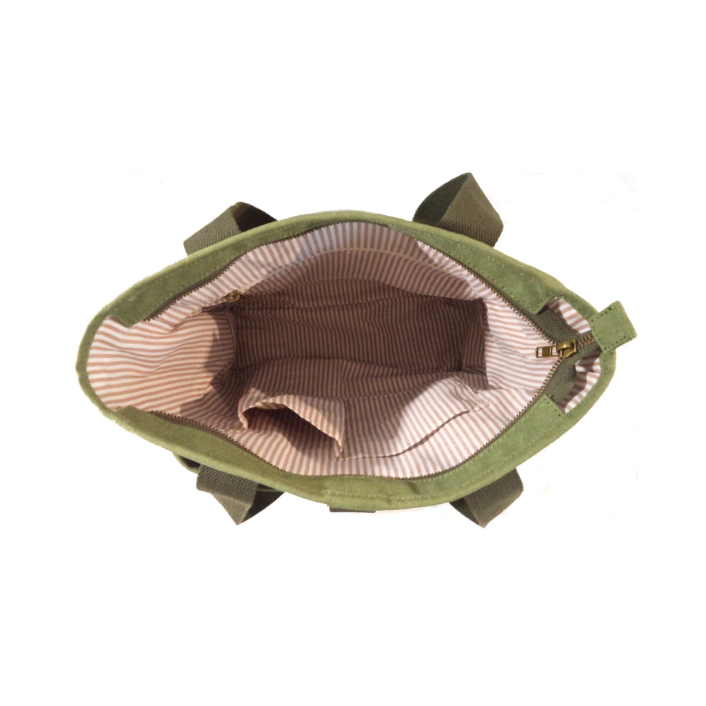 Our bag is crafted from washed green canvas that is 80% cotton and 20% polyester. A large front pocket is on the outside while two stow pockets and one zippered pocket are featured on the inside.