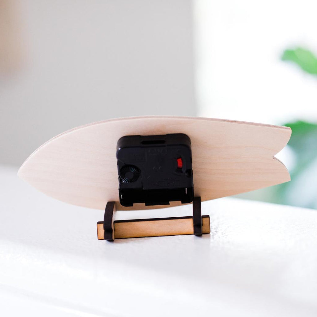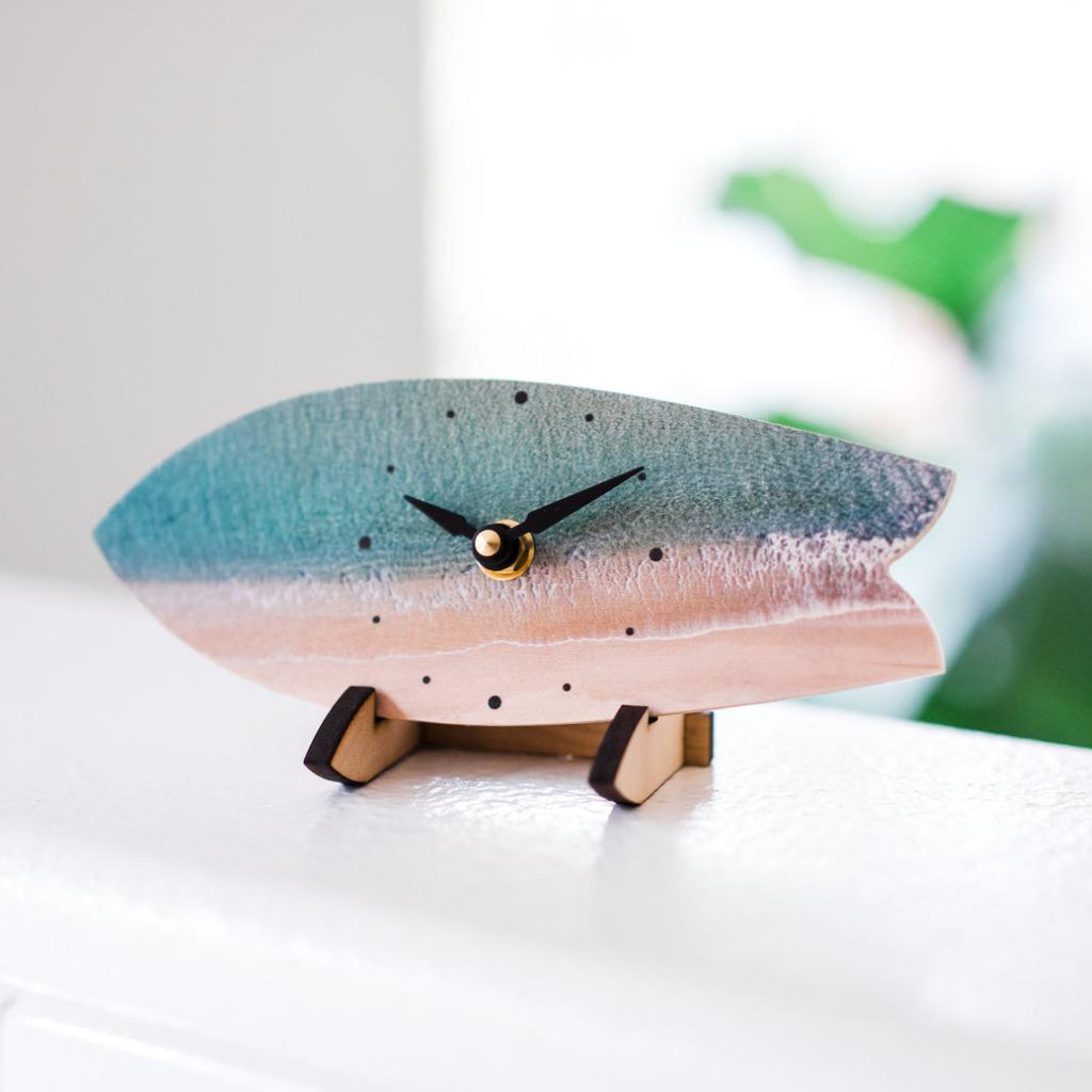 This beautiful surfboard table clock has been printed with eco-friendly, water-based, fade-resistant ink which preserves the vivid colors of each photo and allows the natural grain of birch wood to show through the image. The clock features a picture photographed by local professionals. Each clock is handcrafted in Southern California.