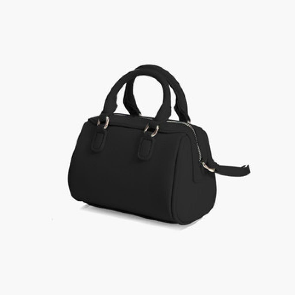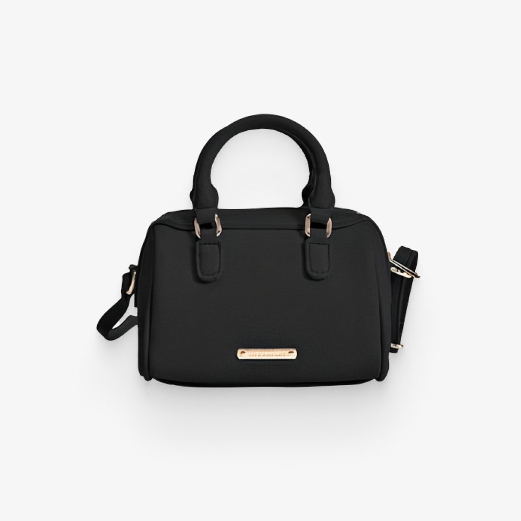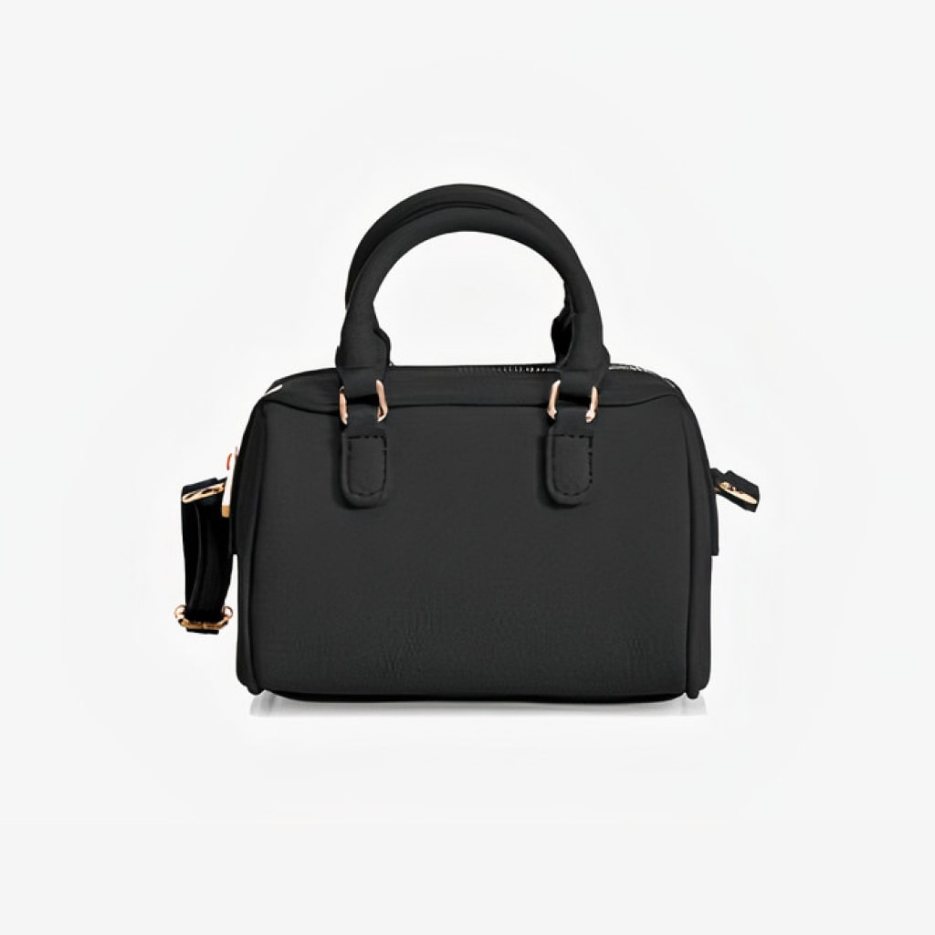 This pebbled vegan leather mini barrel crossbody handbag comes with a main zipper opening and decorated with gold fittings.