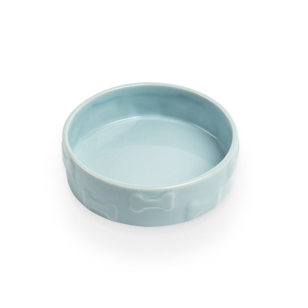 The Manor Blue Pet Bowl is a designer dish in powder blue. Featuring a cute embossed bone design around the outside, these bowls are made of durable stoneware.