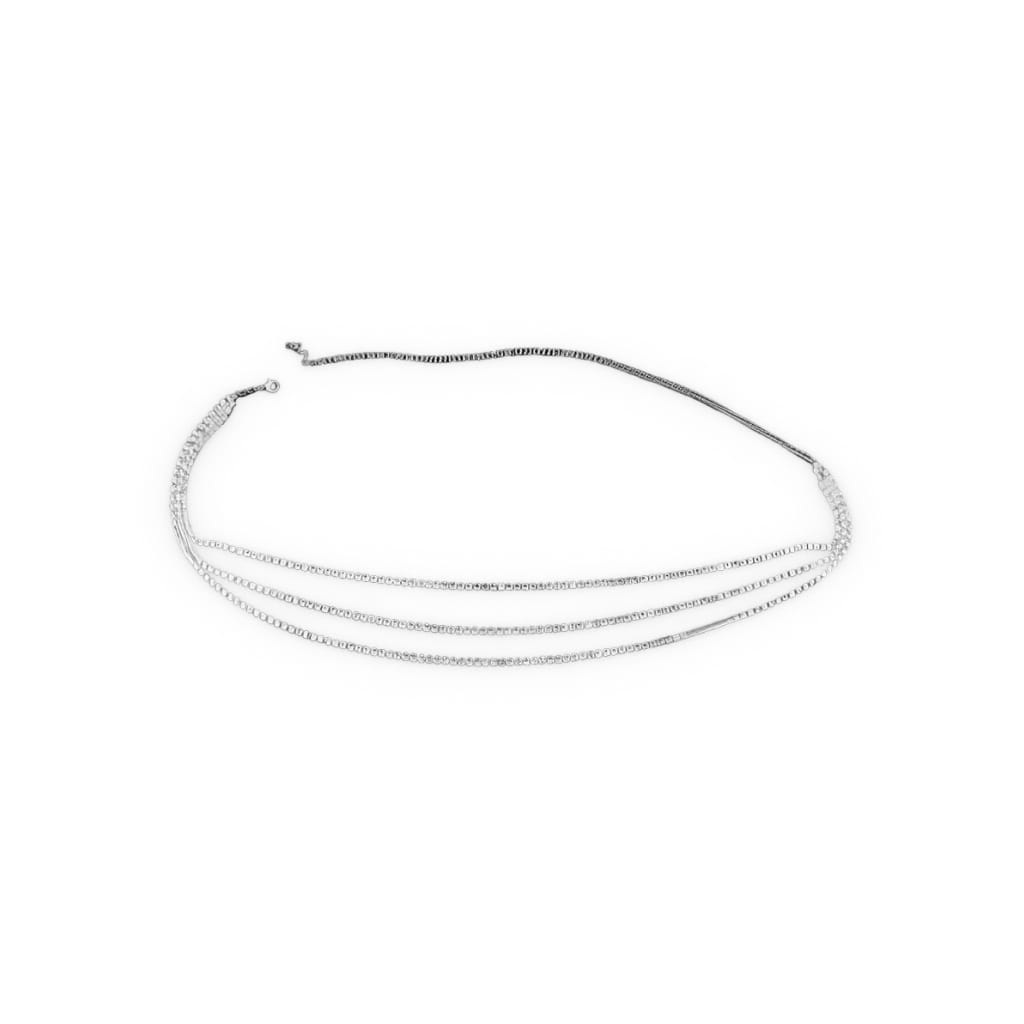 This silver-colored chain is made of brass and garnished with shining rhinestones, creating a beautiful gleam as the chain catches the light. Five lovely heart pendants are hanging along its length.