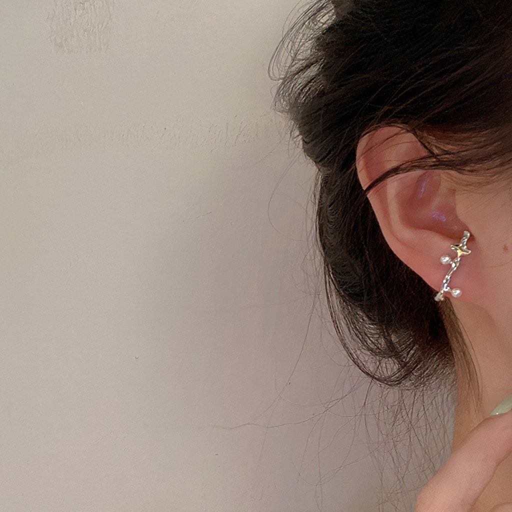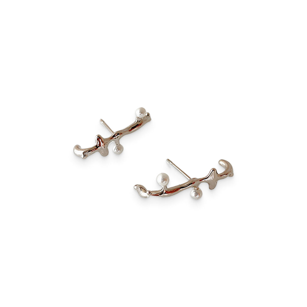 Jewelry materials: brass. Shape: twig-like stud earrings with round beads. Color: silver.