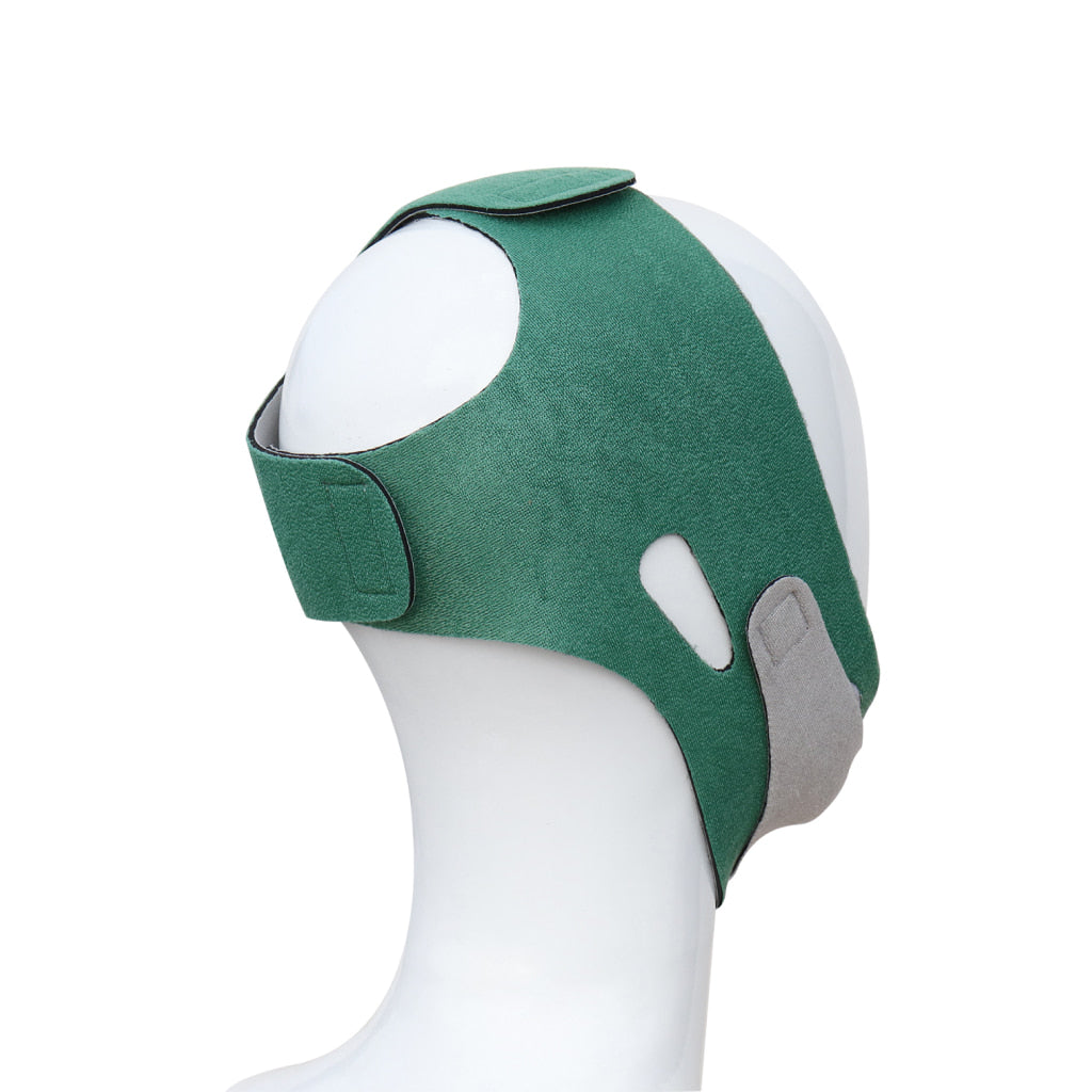 The adjustable bandage is made of breathable fabric. It is reusable and washable. While the bandage firmly fixes your head and tightens your skin, it doesn’t cause any pain.